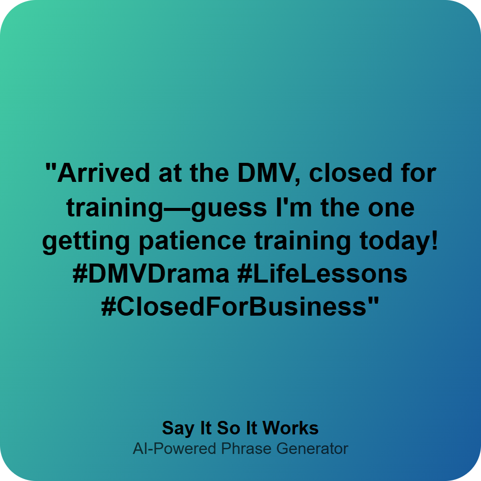 "Arrived at the DMV, closed for training—guess I'm the one getting patience training today! #DMVDrama #LifeLessons #ClosedForBusiness"