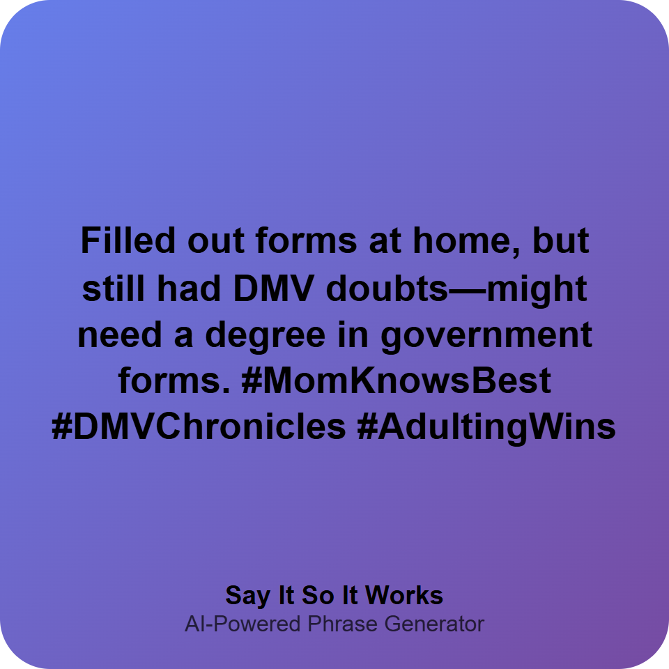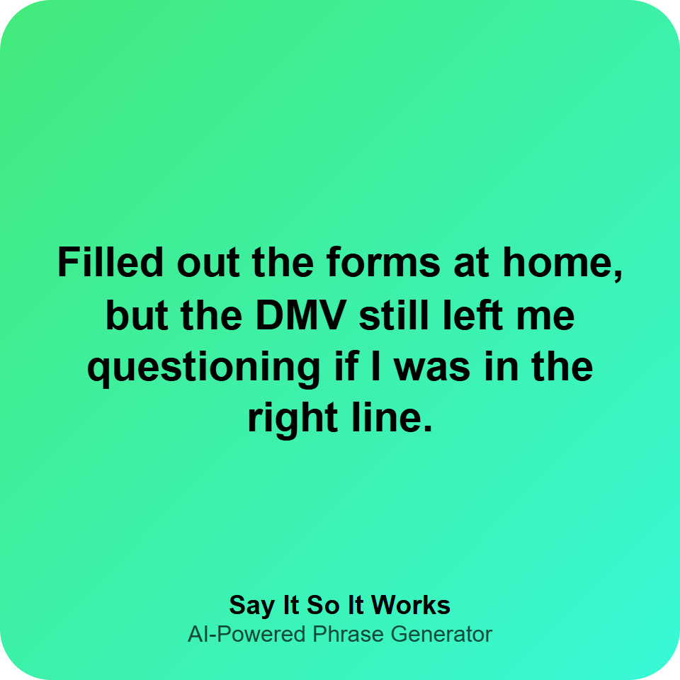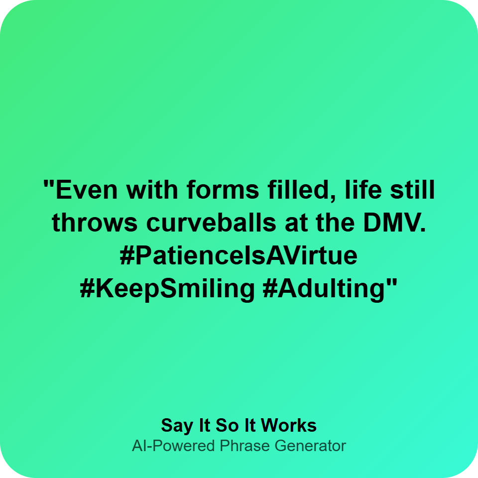 "Even with forms filled, life still throws curveballs at the DMV. #PatienceIsAVirtue #KeepSmiling #Adulting"