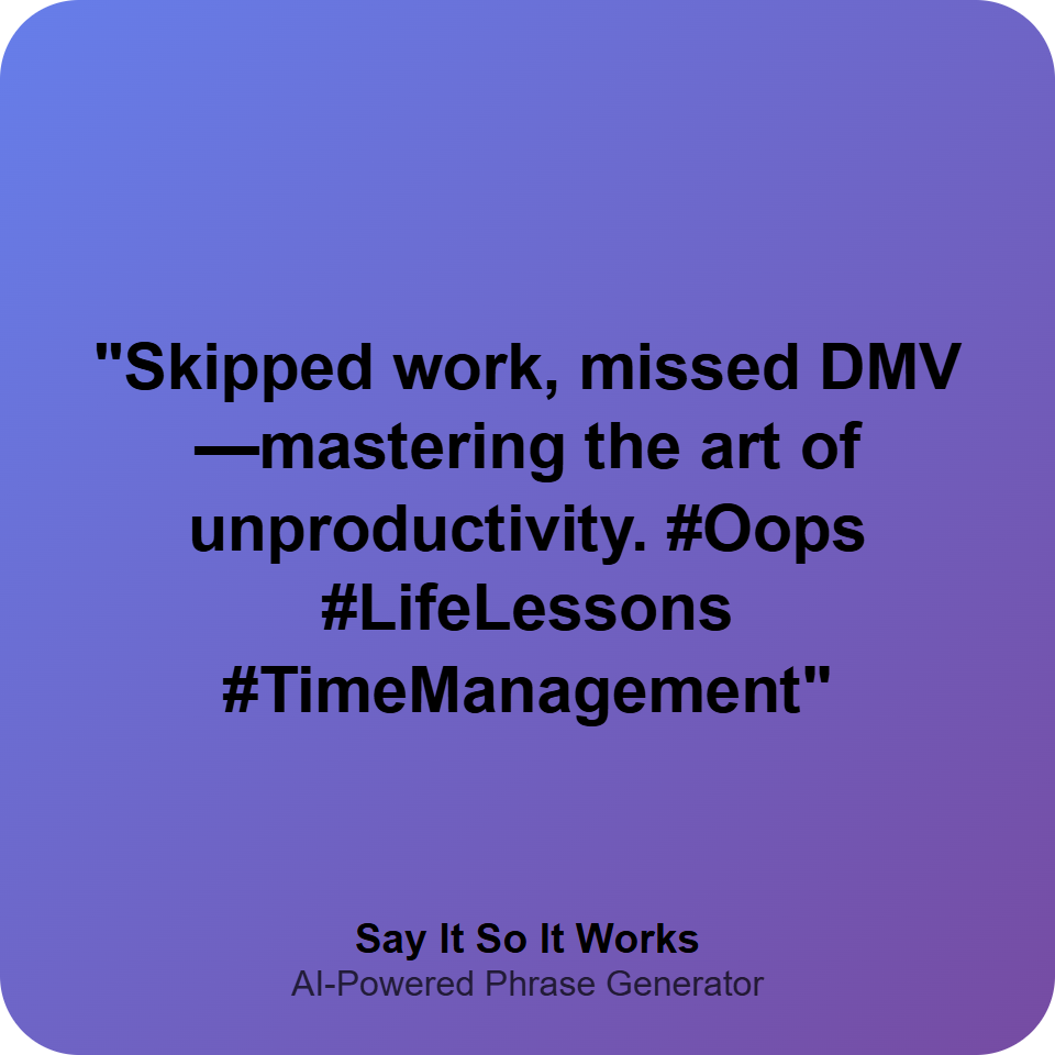 "Skipped work, missed DMV—mastering the art of unproductivity. #Oops #LifeLessons #TimeManagement"