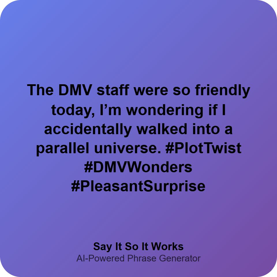The DMV staff were so friendly today, I’m wondering if I accidentally walked into a parallel universe. #PlotTwist #DMVWonders #PleasantSurprise