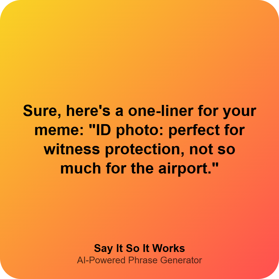 Sure, here's a one-liner for your meme: "ID photo: perfect for witness protection, not so much for the airport."