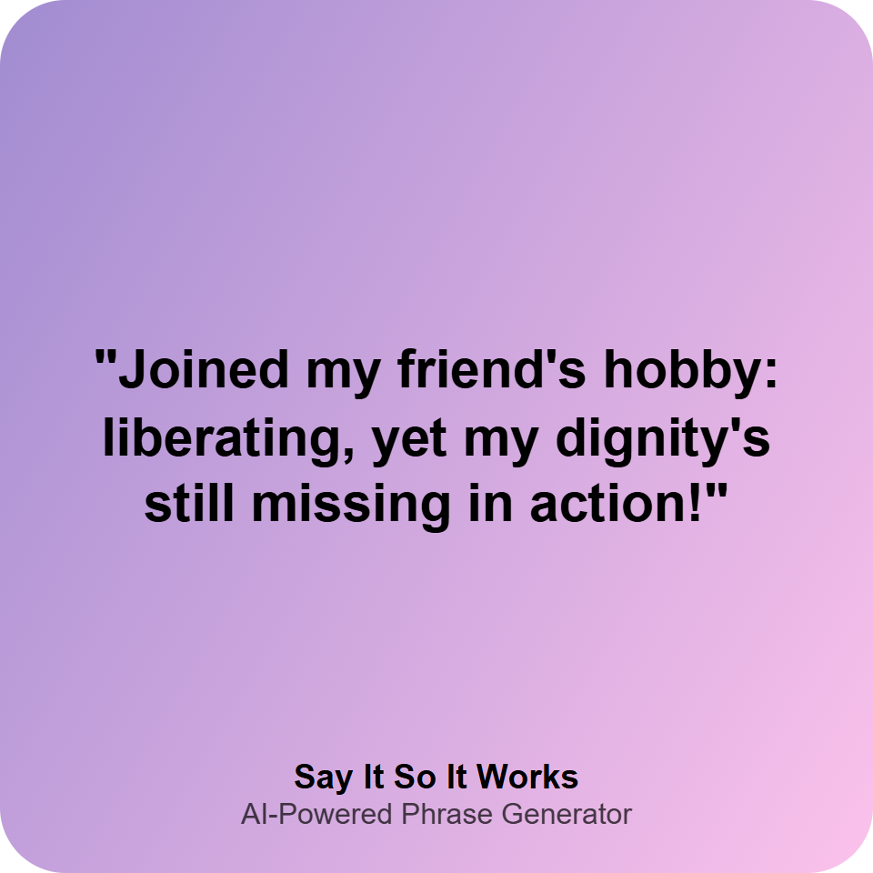 "Joined my friend's hobby: liberating, yet my dignity's still missing in action!"