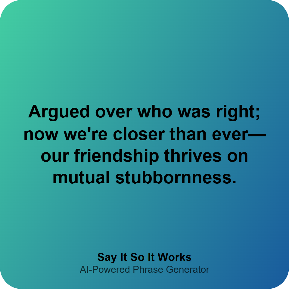 Argued over who was right; now we're closer than ever—our friendship thrives on mutual stubbornness.