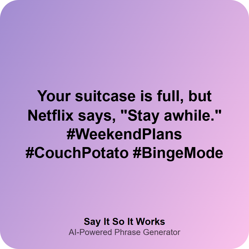 Your suitcase is full, but Netflix says, "Stay awhile." #WeekendPlans #CouchPotato #BingeMode