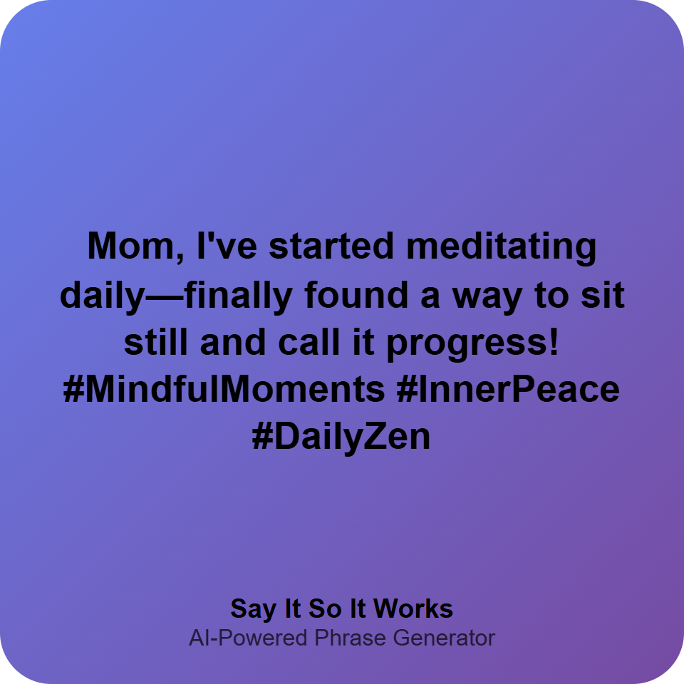 Mom, I've started meditating daily—finally found a way to sit still and call it progress! #MindfulMoments #InnerPeace #DailyZen