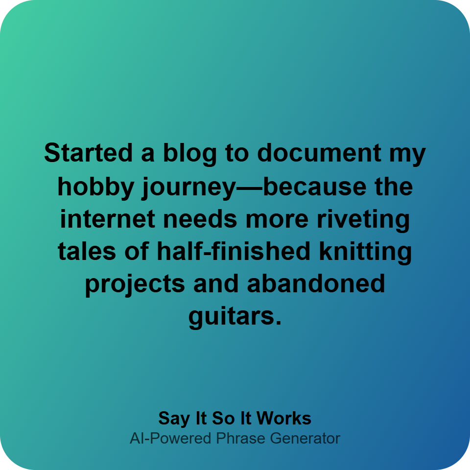 Started a blog to document my hobby journey—because the internet needs more riveting tales of half-finished knitting projects and abandoned guitars.