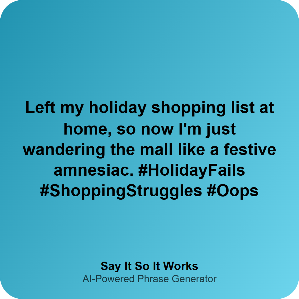 Left my holiday shopping list at home, so now I'm just wandering the mall like a festive amnesiac. #HolidayFails #ShoppingStruggles #Oops
