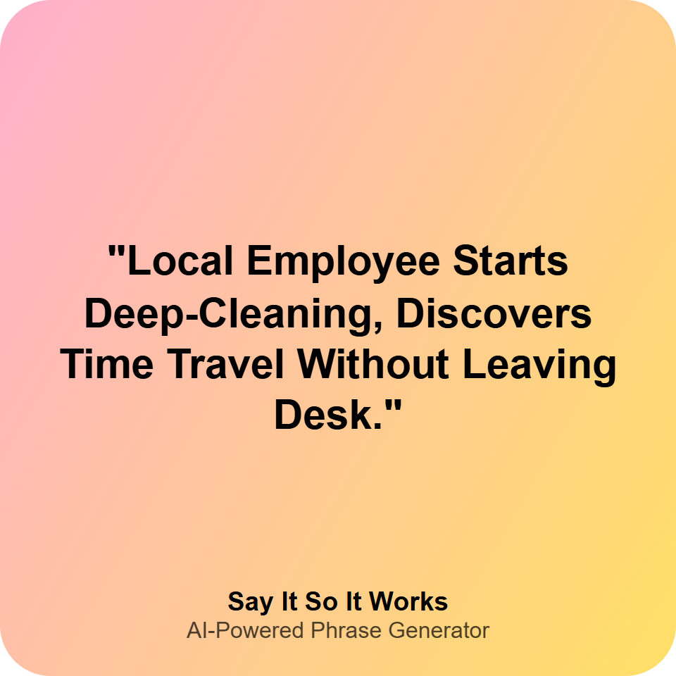 "Local Employee Starts Deep-Cleaning, Discovers Time Travel Without Leaving Desk."