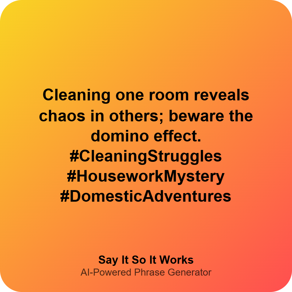 Cleaning one room reveals chaos in others; beware the domino effect. #CleaningStruggles #HouseworkMystery #DomesticAdventures