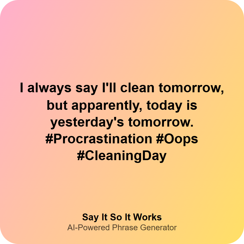 I always say I'll clean tomorrow, but apparently, today is yesterday's tomorrow. #Procrastination #Oops #CleaningDay