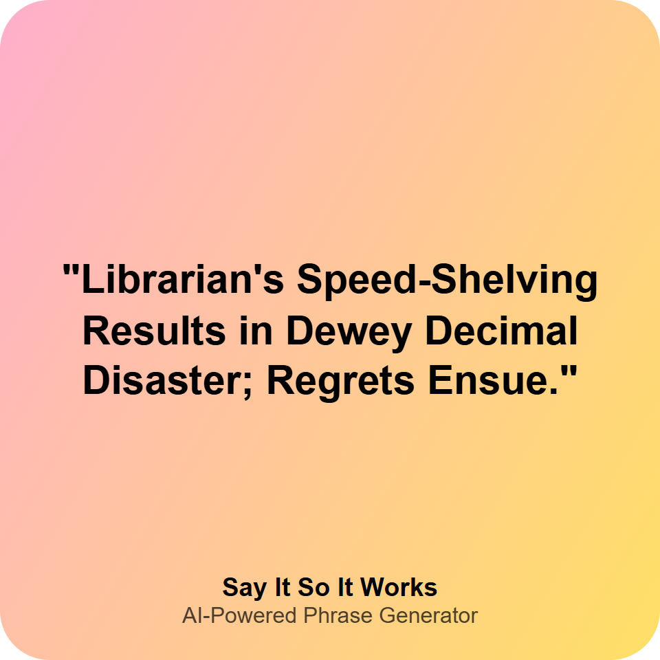 "Librarian's Speed-Shelving Results in Dewey Decimal Disaster; Regrets Ensue."