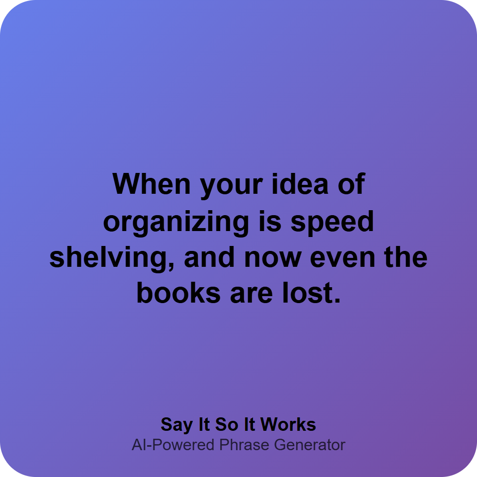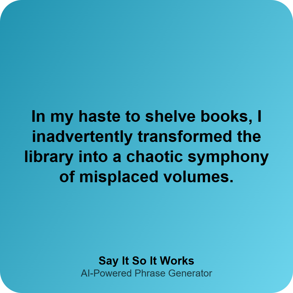 In my haste to shelve books, I inadvertently transformed the library into a chaotic symphony of misplaced volumes.