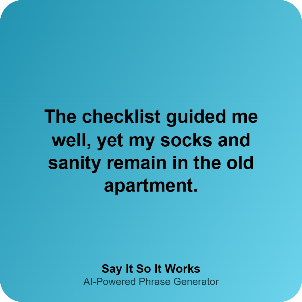The checklist guided me well, yet my socks and sanity remain in the old apartment.