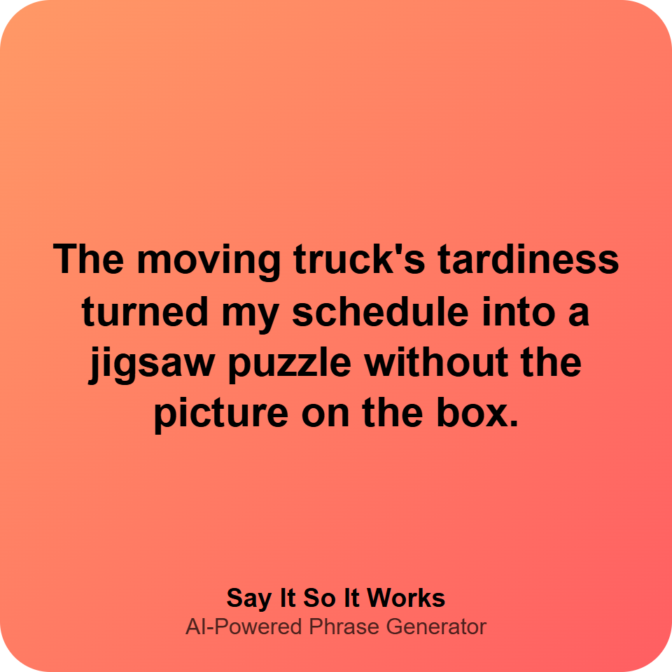 The moving truck's tardiness turned my schedule into a jigsaw puzzle without the picture on the box.