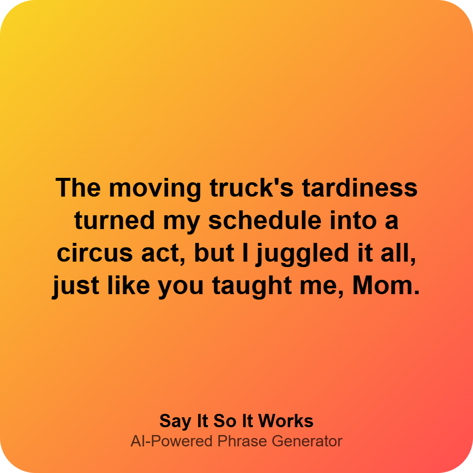The moving truck's tardiness turned my schedule into a circus act, but I juggled it all, just like you taught me, Mom.