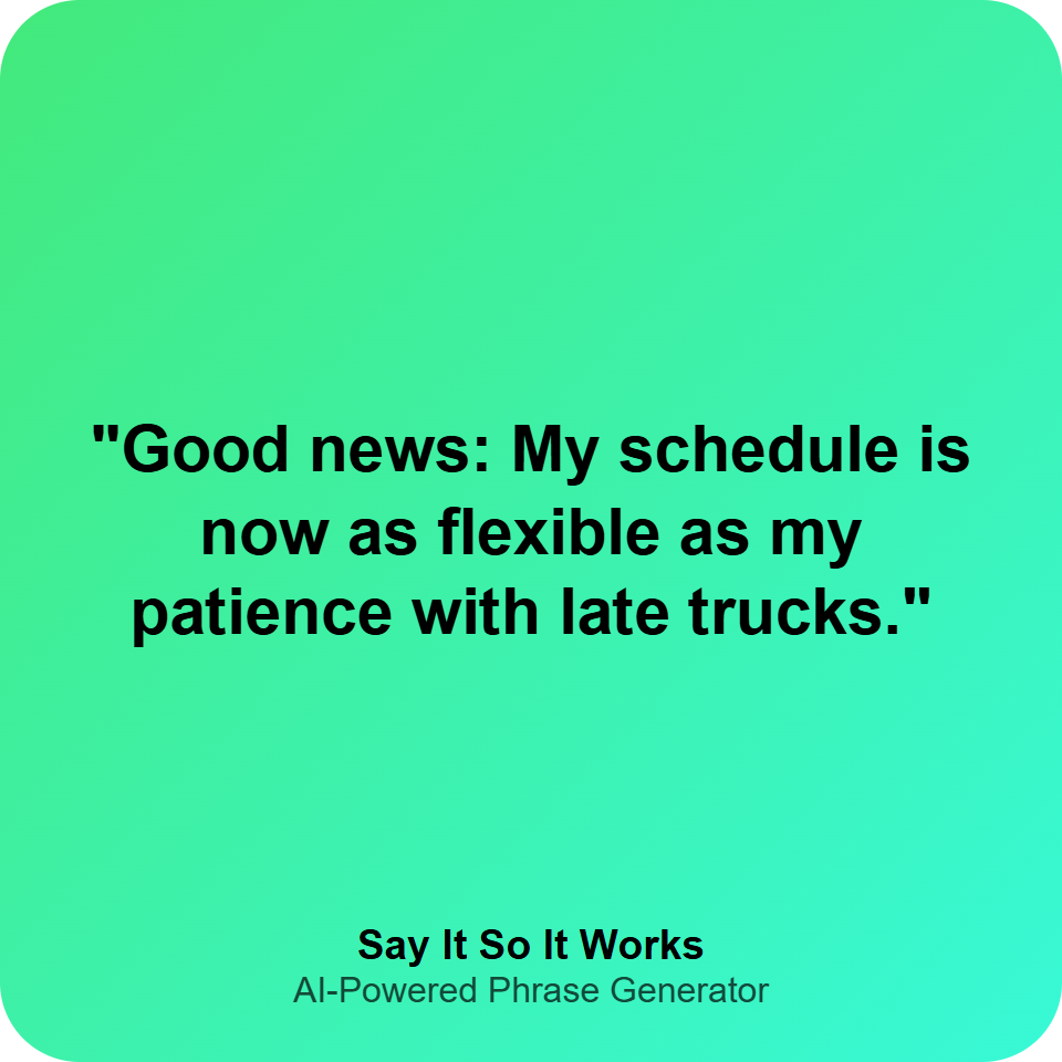 "Good news: My schedule is now as flexible as my patience with late trucks."
