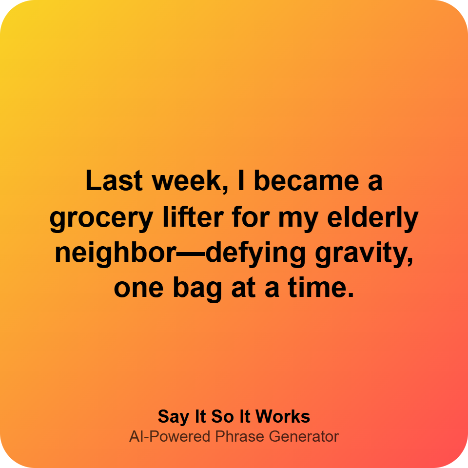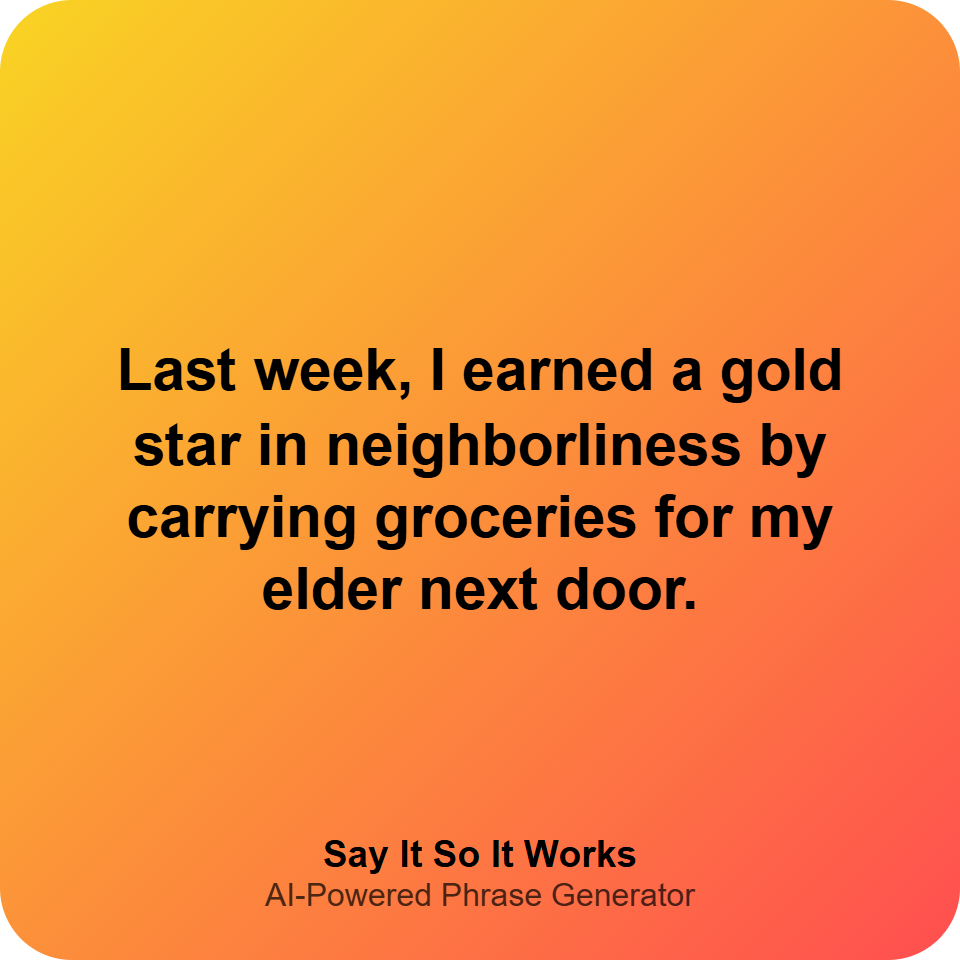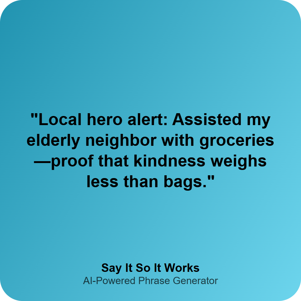 "Local hero alert: Assisted my elderly neighbor with groceries—proof that kindness weighs less than bags."