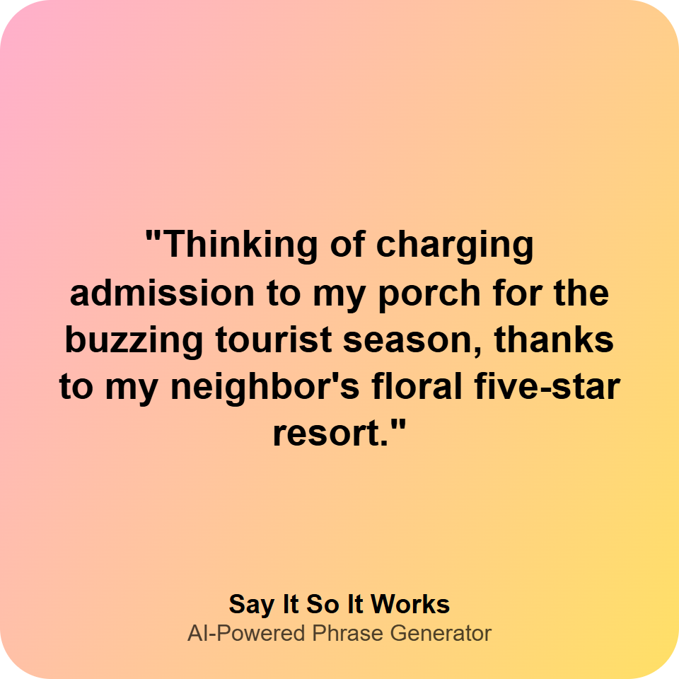 "Thinking of charging admission to my porch for the buzzing tourist season, thanks to my neighbor's floral five-star resort."