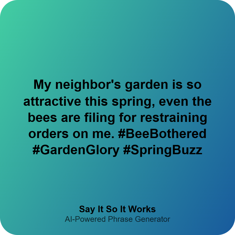 My neighbor's garden is so attractive this spring, even the bees are filing for restraining orders on me. #BeeBothered #GardenGlory #SpringBuzz