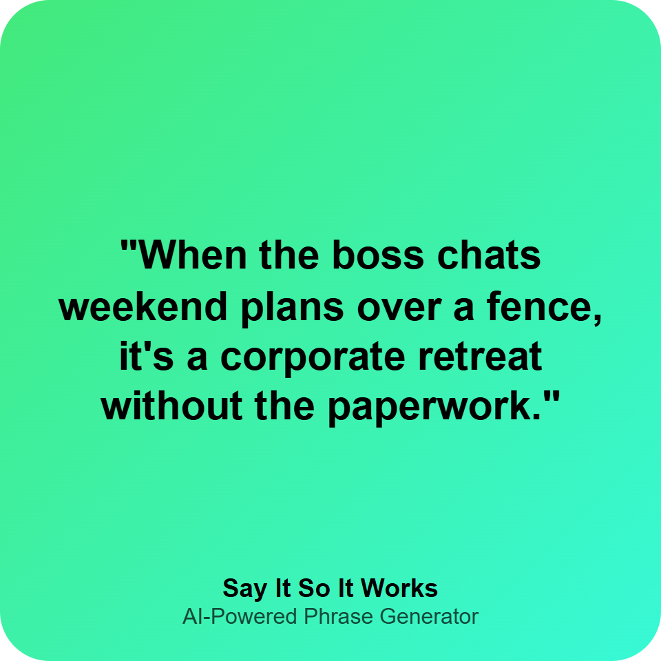 "When the boss chats weekend plans over a fence, it's a corporate retreat without the paperwork."