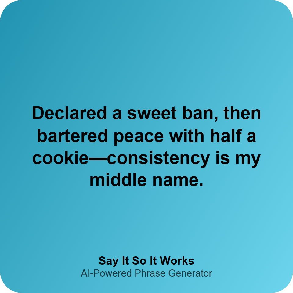 Declared a sweet ban, then bartered peace with half a cookie—consistency is my middle name.