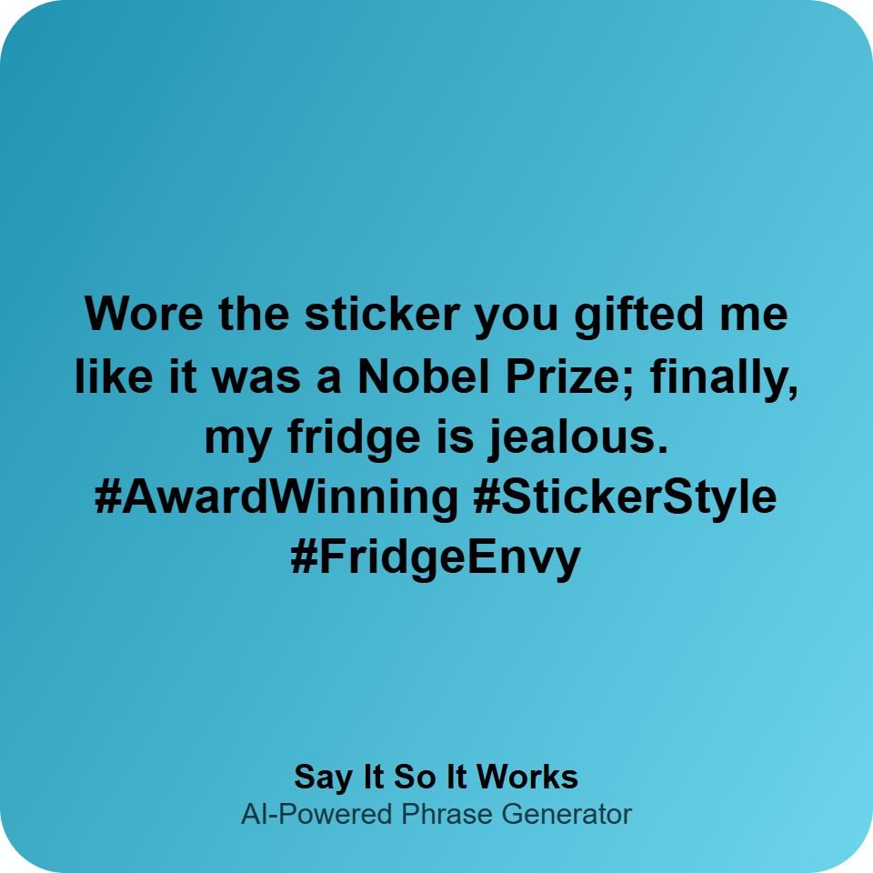 Wore the sticker you gifted me like it was a Nobel Prize; finally, my fridge is jealous. #AwardWinning #StickerStyle #FridgeEnvy