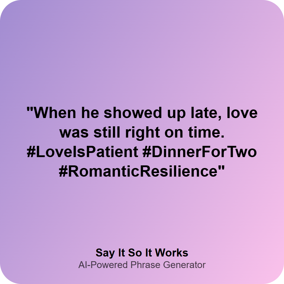 "When he showed up late, love was still right on time. #LoveIsPatient #DinnerForTwo #RomanticResilience"