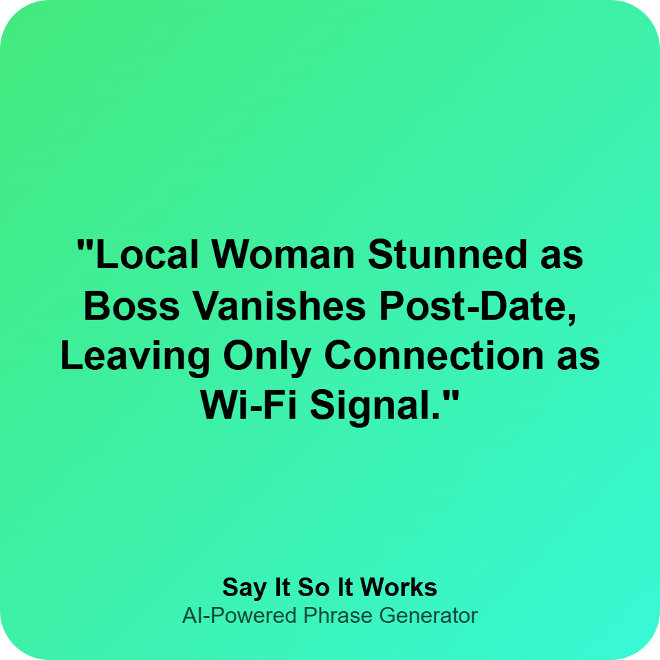 "Local Woman Stunned as Boss Vanishes Post-Date, Leaving Only Connection as Wi-Fi Signal."
