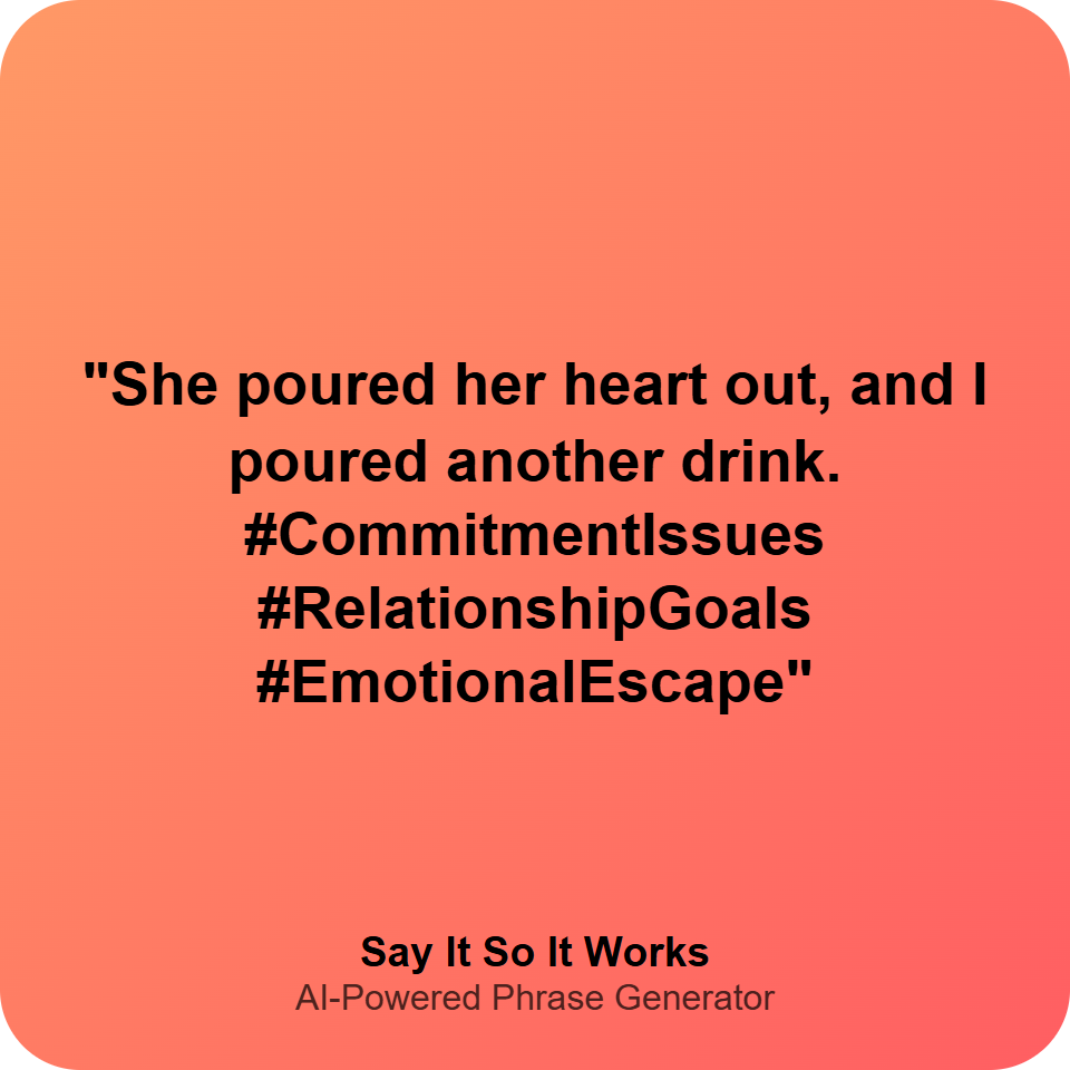 "She poured her heart out, and I poured another drink. #CommitmentIssues #RelationshipGoals #EmotionalEscape"
