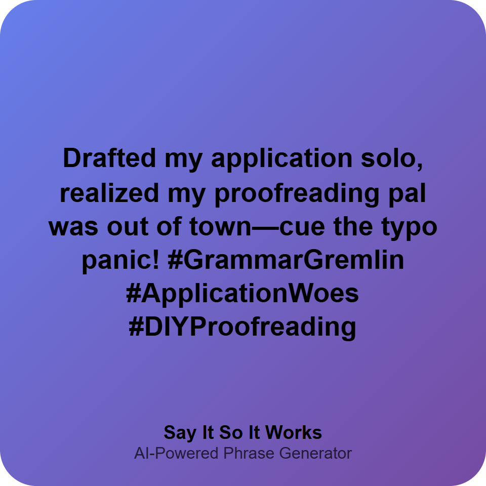 Drafted my application solo, realized my proofreading pal was out of town—cue the typo panic! #GrammarGremlin #ApplicationWoes #DIYProofreading