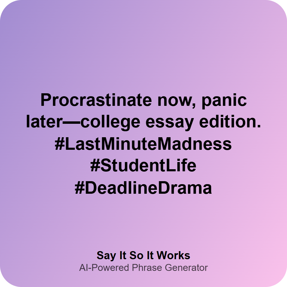 Procrastinate now, panic later—college essay edition. #LastMinuteMadness #StudentLife #DeadlineDrama