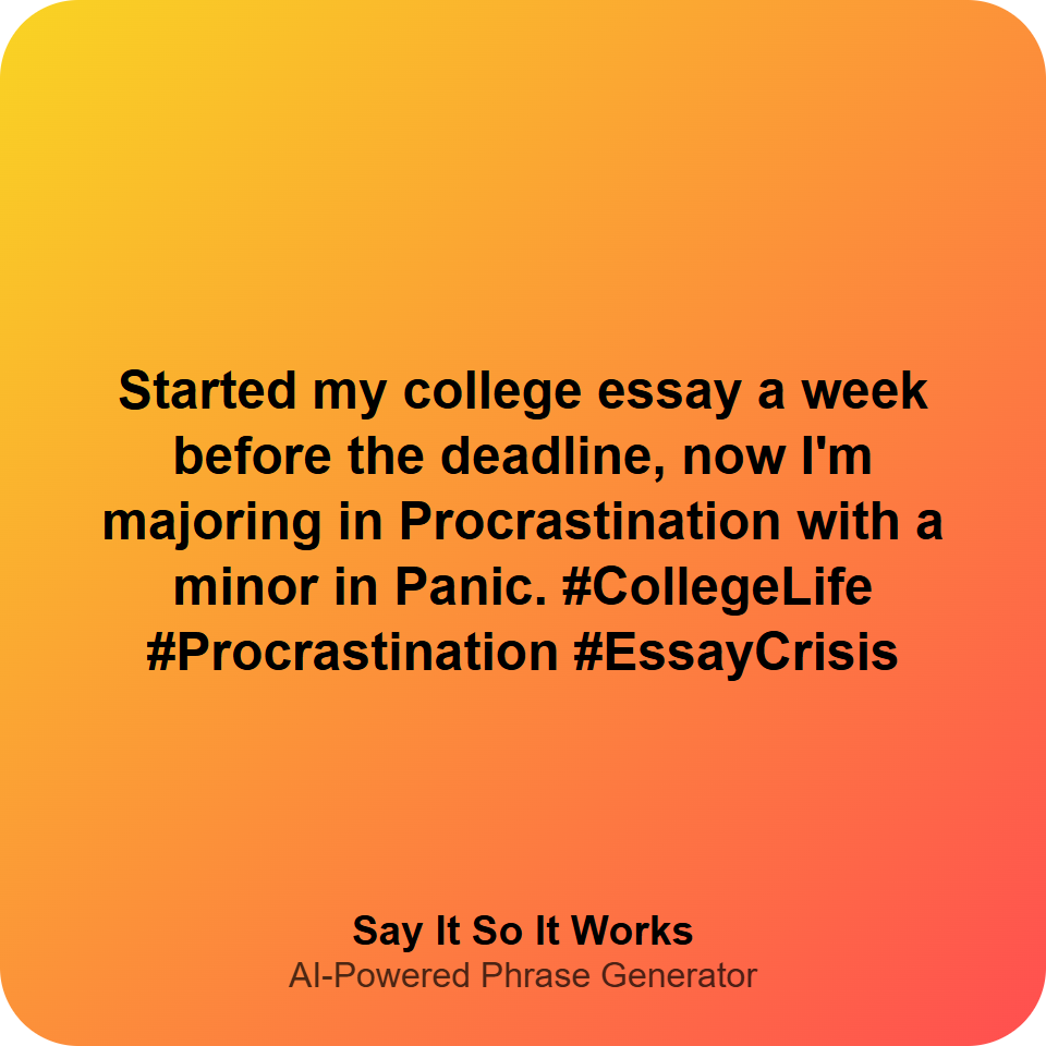 Started my college essay a week before the deadline, now I'm majoring in Procrastination with a minor in Panic. #CollegeLife #Procrastination #EssayCrisis