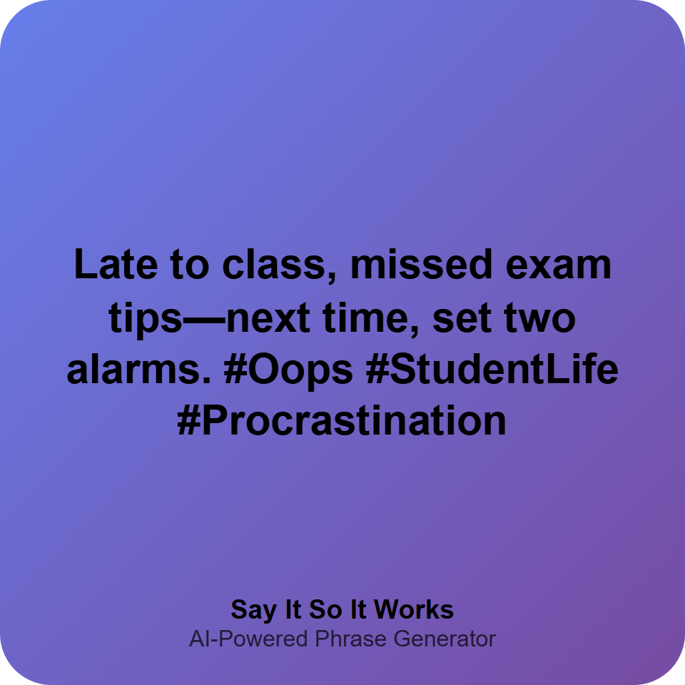 Late to class, missed exam tips—next time, set two alarms. #Oops #StudentLife #Procrastination