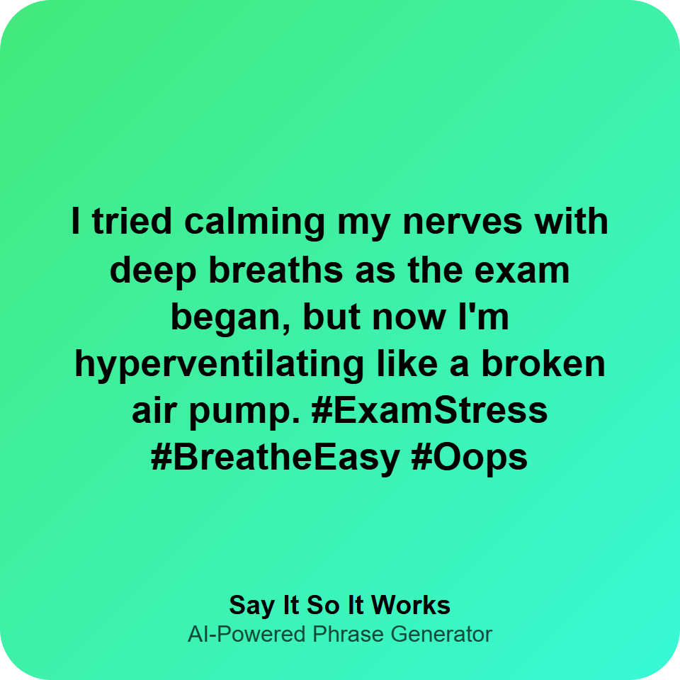 I tried calming my nerves with deep breaths as the exam began, but now I'm hyperventilating like a broken air pump. #ExamStress #BreatheEasy #Oops