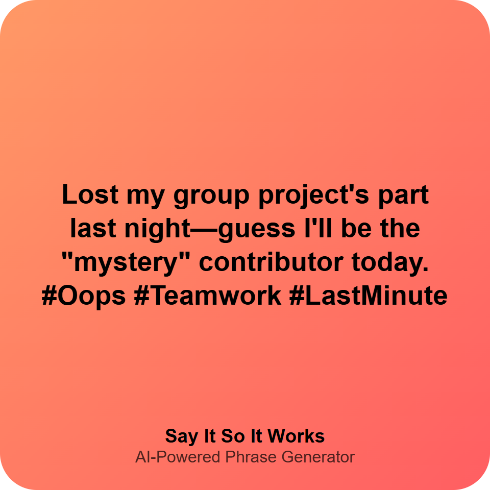 Lost my group project's part last night—guess I'll be the "mystery" contributor today. #Oops #Teamwork #LastMinute