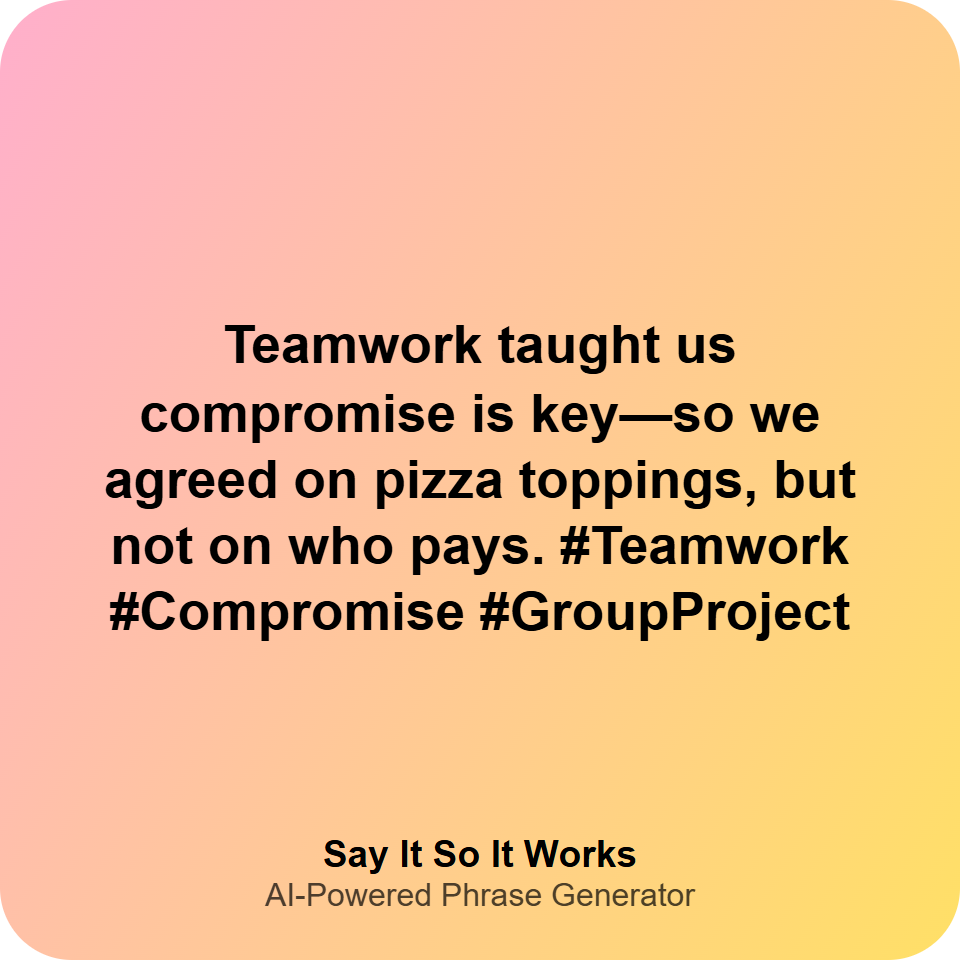 Teamwork taught us compromise is key—so we agreed on pizza toppings, but not on who pays. #Teamwork #Compromise #GroupProject