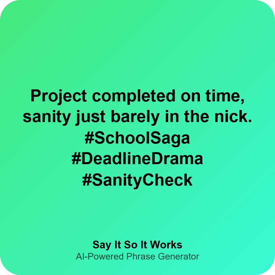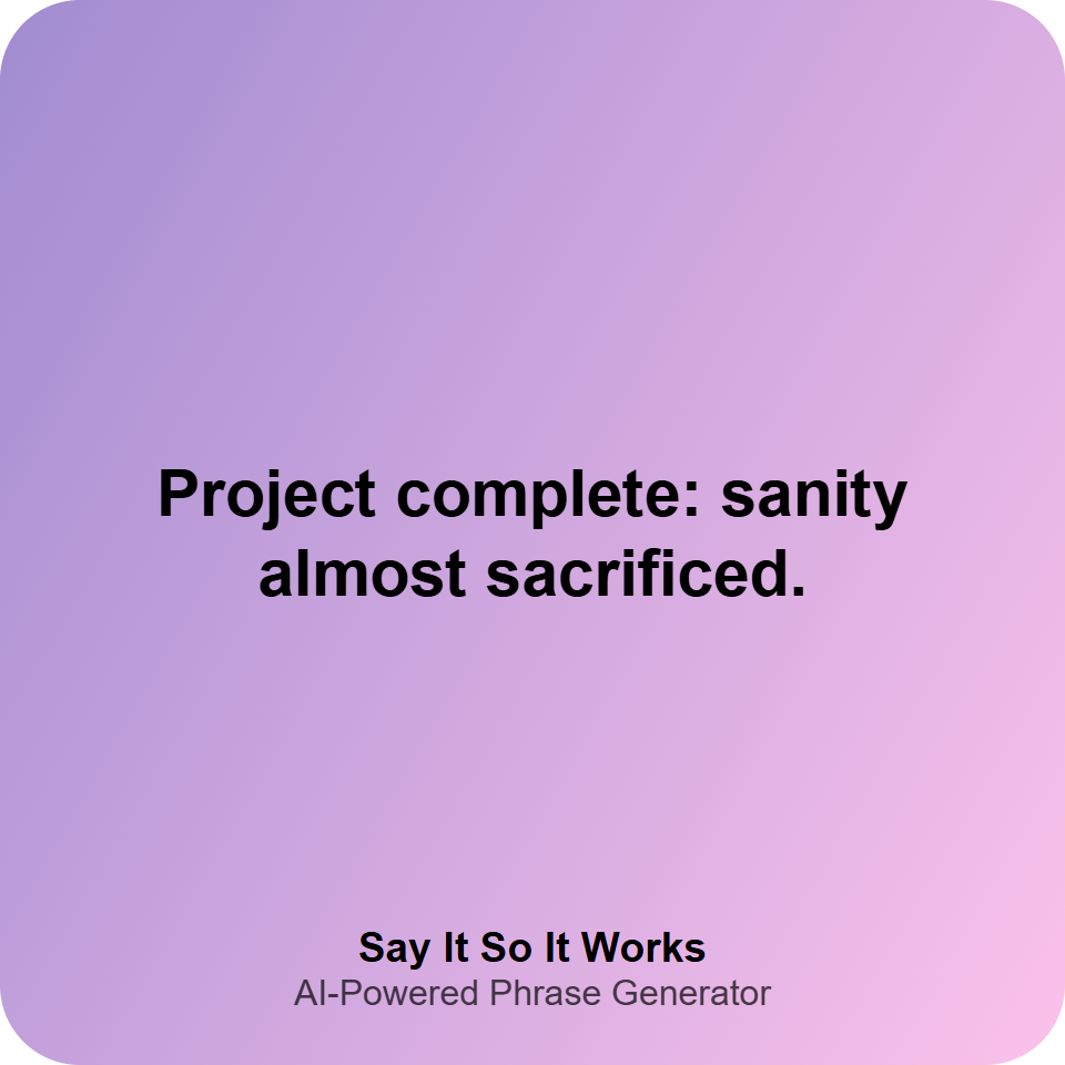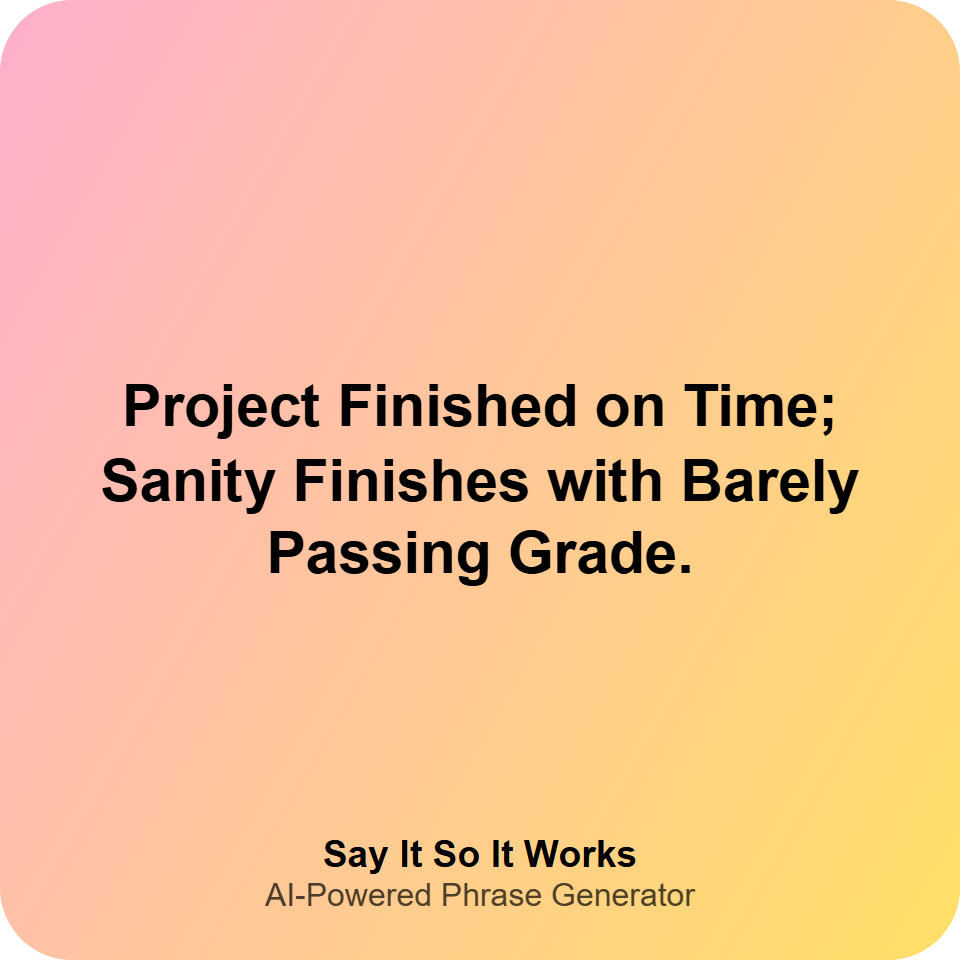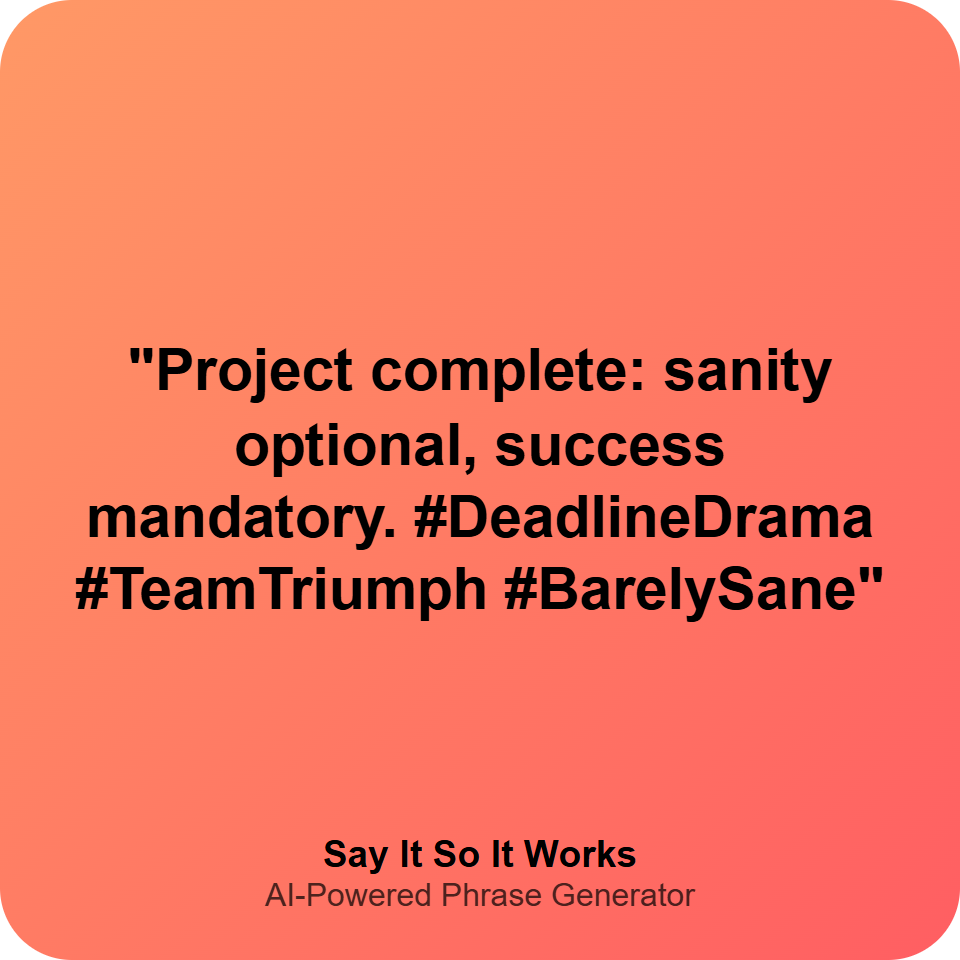 "Project complete: sanity optional, success mandatory. #DeadlineDrama #TeamTriumph #BarelySane"