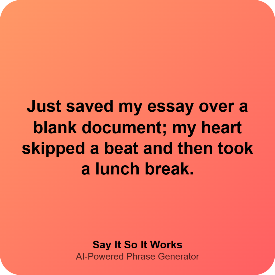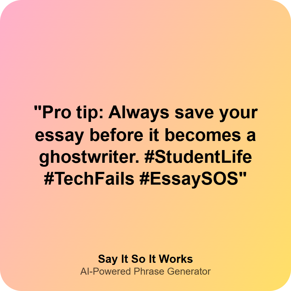 "Pro tip: Always save your essay before it becomes a ghostwriter. #StudentLife #TechFails #EssaySOS"