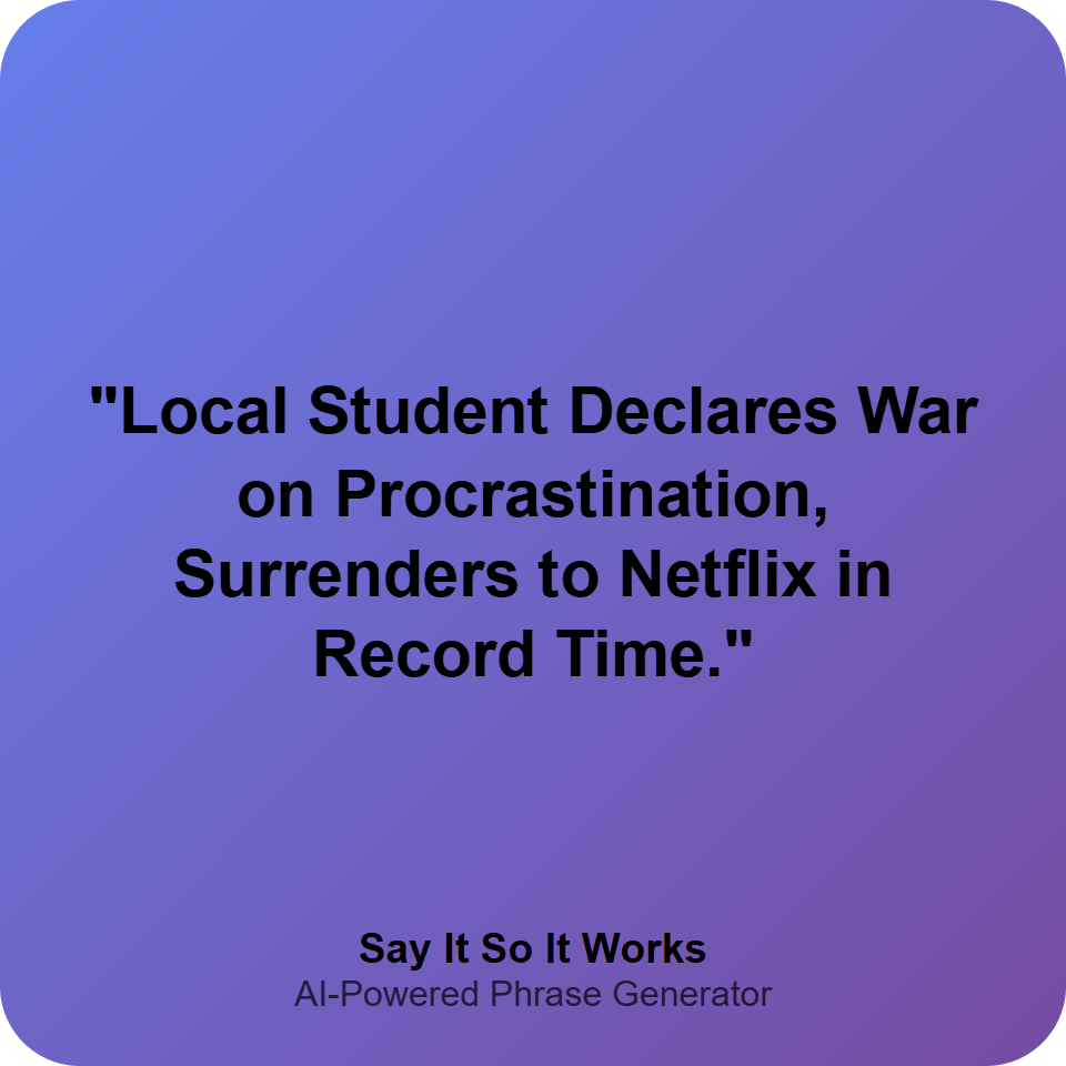 "Local Student Declares War on Procrastination, Surrenders to Netflix in Record Time."