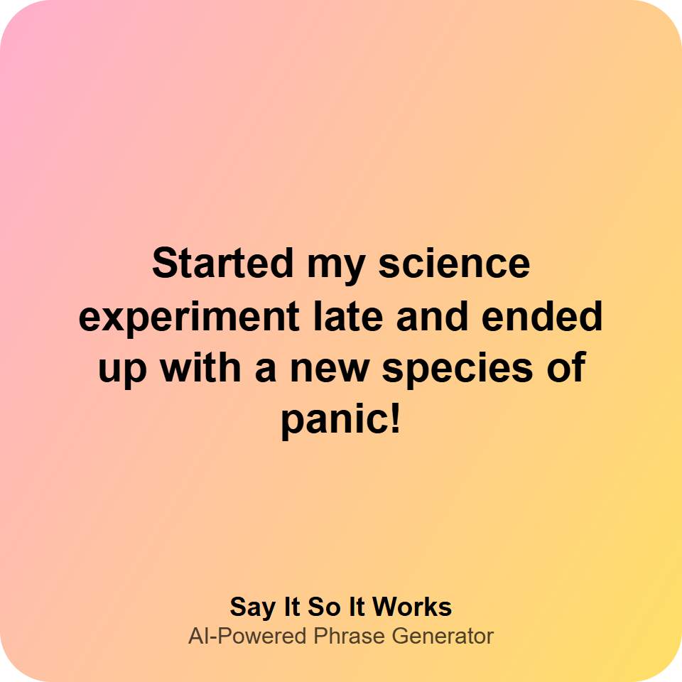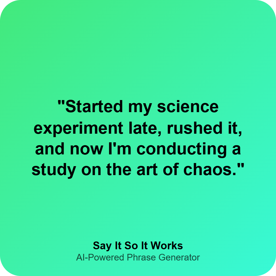 "Started my science experiment late, rushed it, and now I'm conducting a study on the art of chaos."
