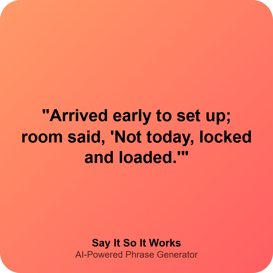 "Arrived early to set up; room said, 'Not today, locked and loaded.'"