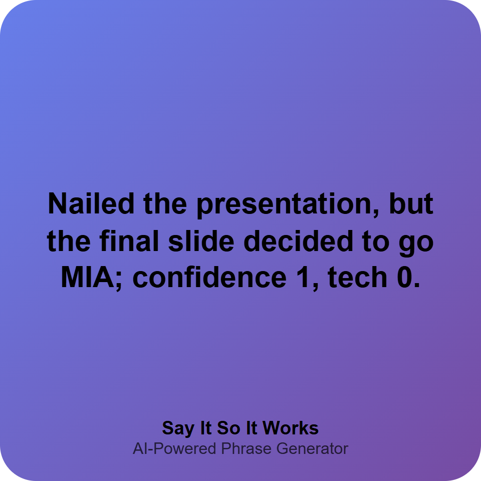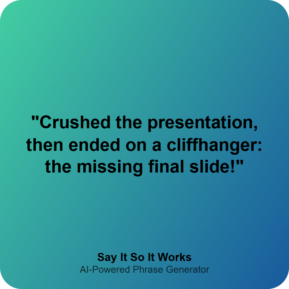 "Crushed the presentation, then ended on a cliffhanger: the missing final slide!"
