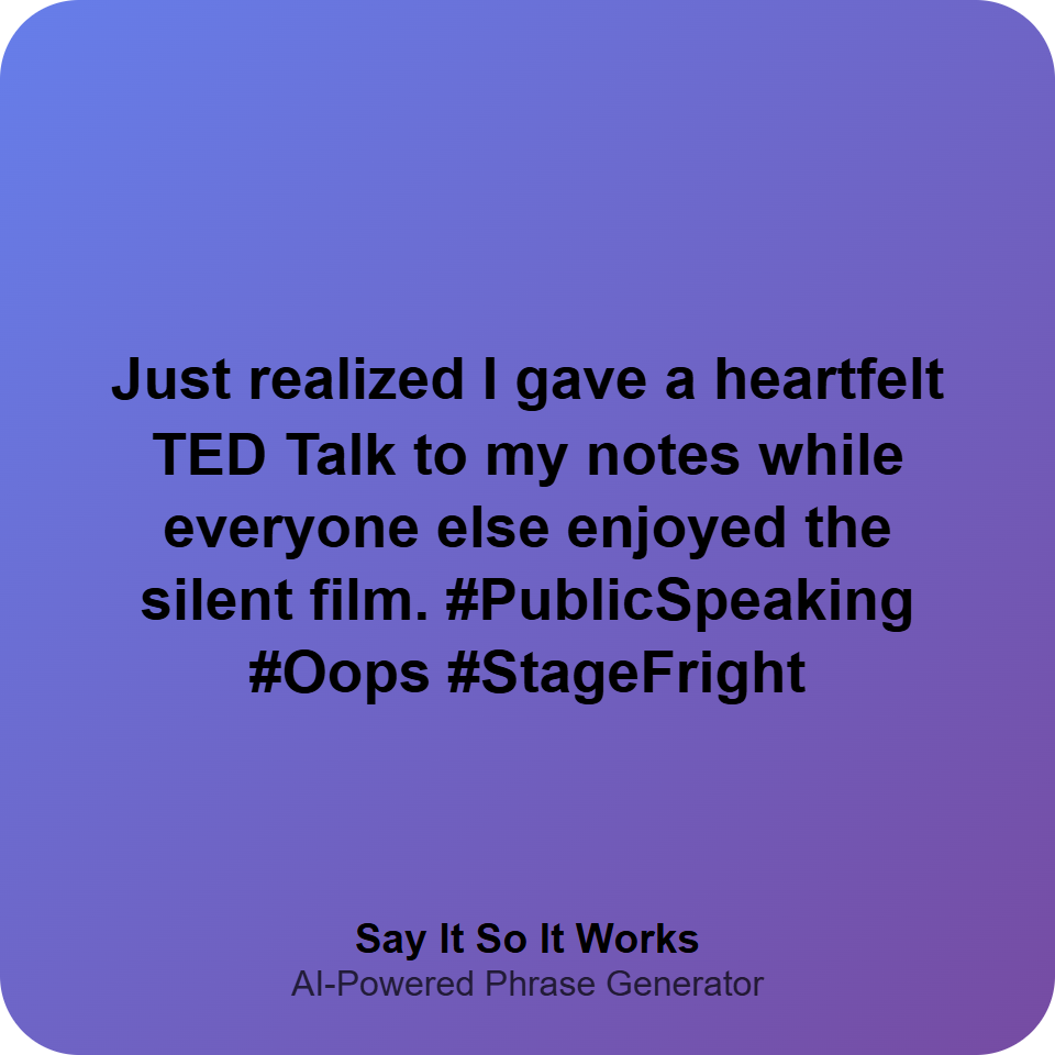 Just realized I gave a heartfelt TED Talk to my notes while everyone else enjoyed the silent film. #PublicSpeaking #Oops #StageFright