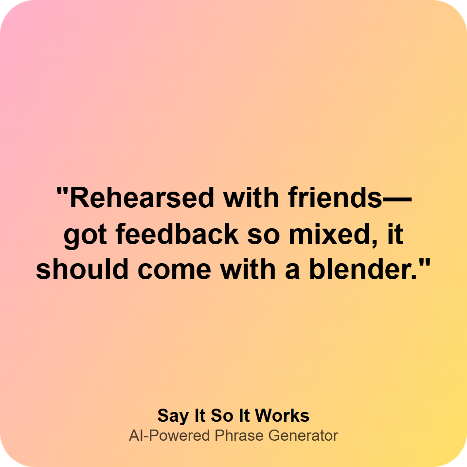 "Rehearsed with friends—got feedback so mixed, it should come with a blender."