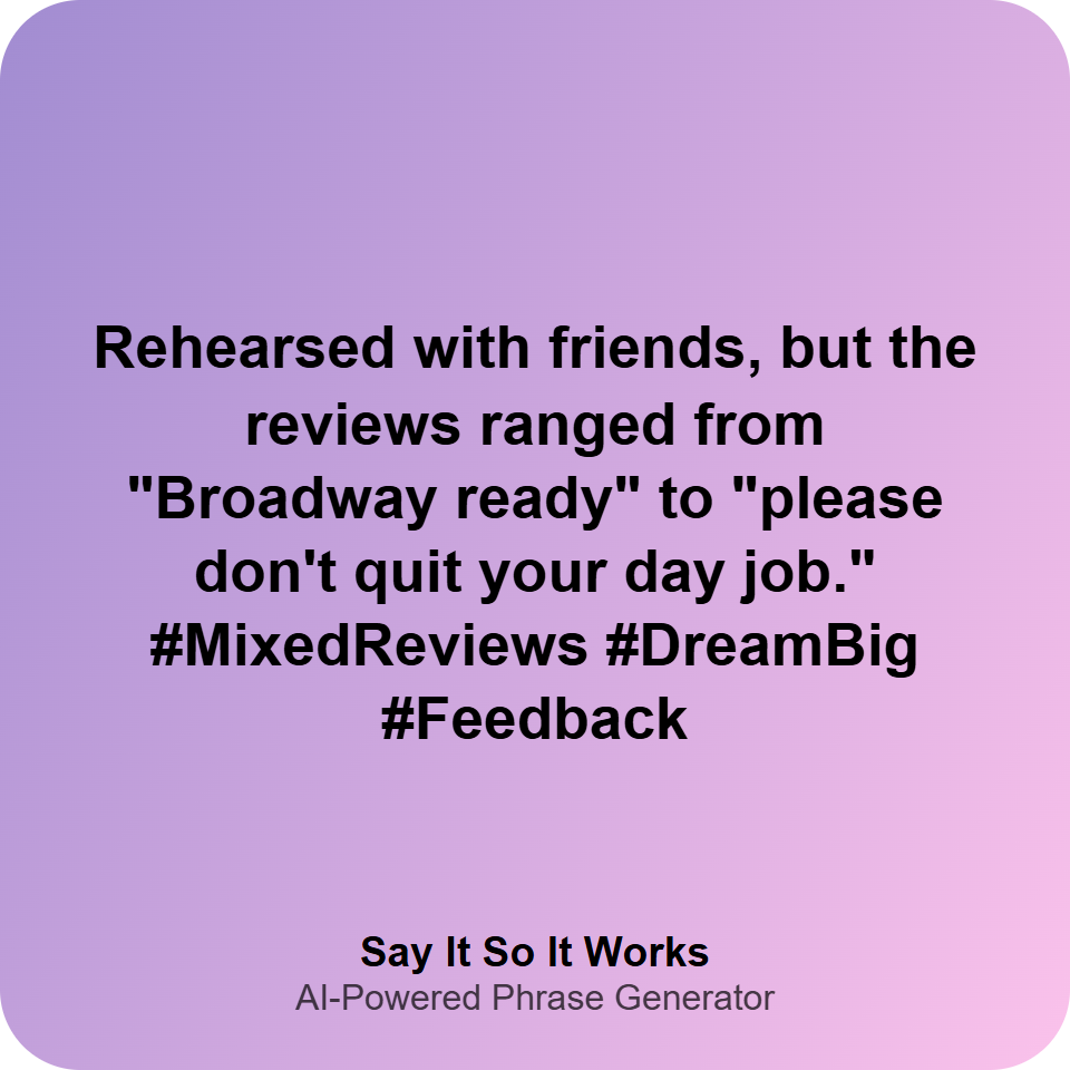 Rehearsed with friends, but the reviews ranged from "Broadway ready" to "please don't quit your day job." #MixedReviews #DreamBig #Feedback