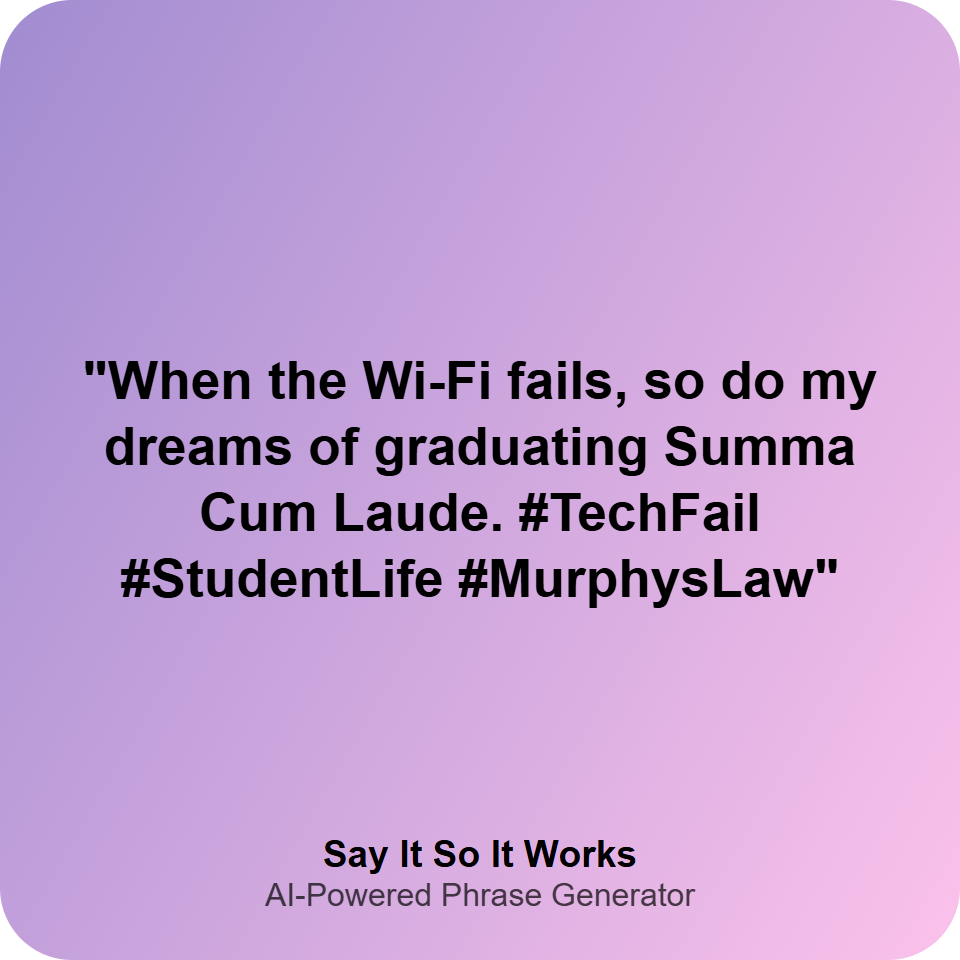 "When the Wi-Fi fails, so do my dreams of graduating Summa Cum Laude. #TechFail #StudentLife #MurphysLaw"