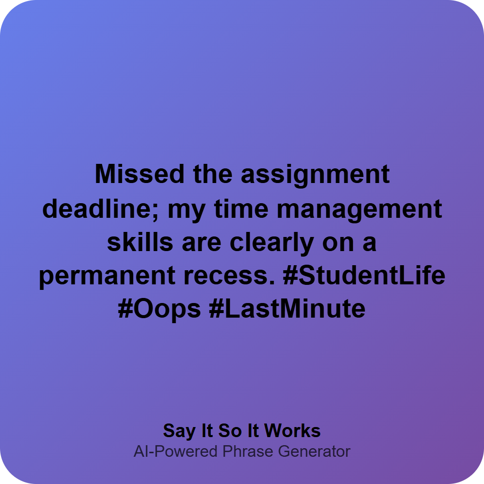 Missed the assignment deadline; my time management skills are clearly on a permanent recess. #StudentLife #Oops #LastMinute
