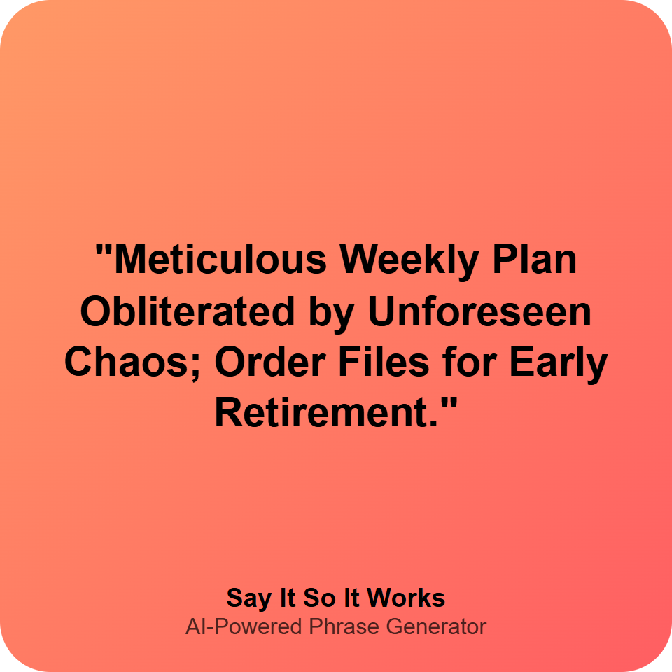 "Meticulous Weekly Plan Obliterated by Unforeseen Chaos; Order Files for Early Retirement."