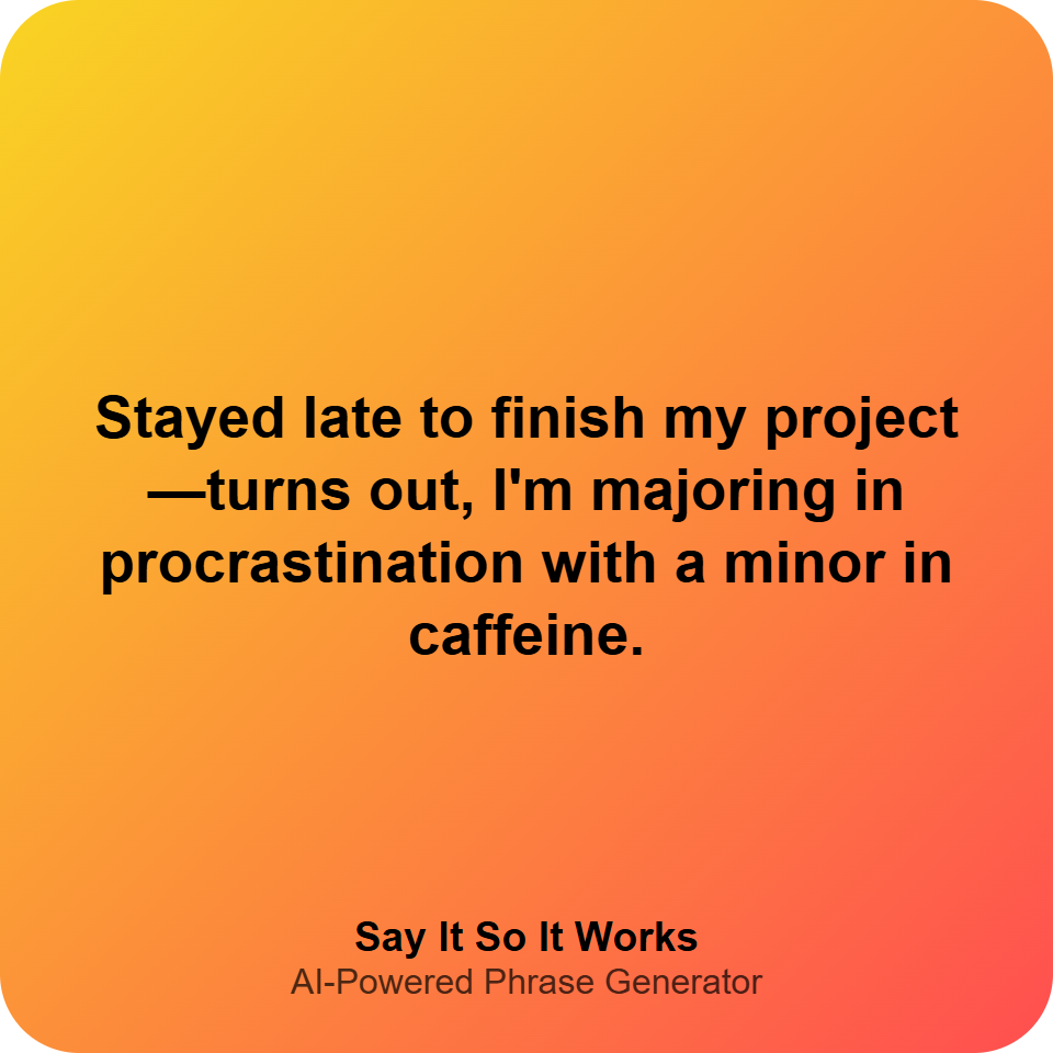 Stayed late to finish my project—turns out, I'm majoring in procrastination with a minor in caffeine.