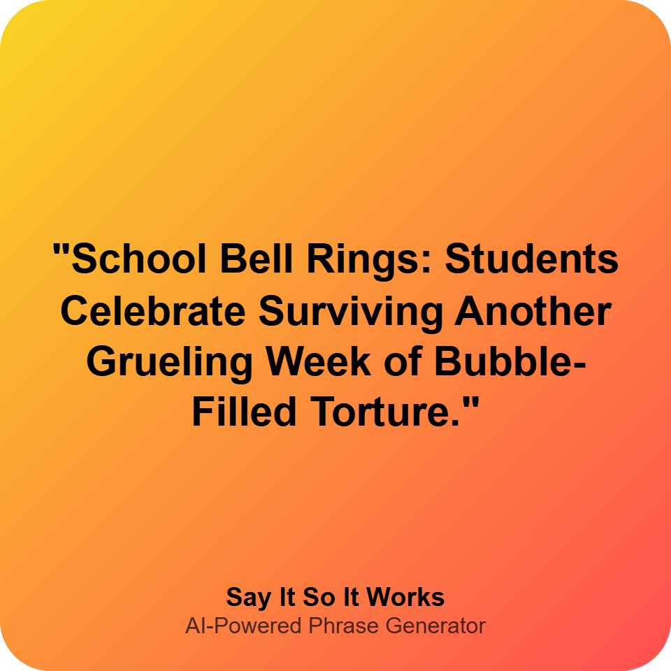 "School Bell Rings: Students Celebrate Surviving Another Grueling Week of Bubble-Filled Torture."